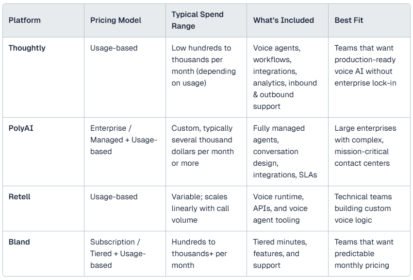 Enterprise platforms like PolyAI bundle technology with services and support, which can simplify deployment but often require higher upfront commitments and long-term contracts