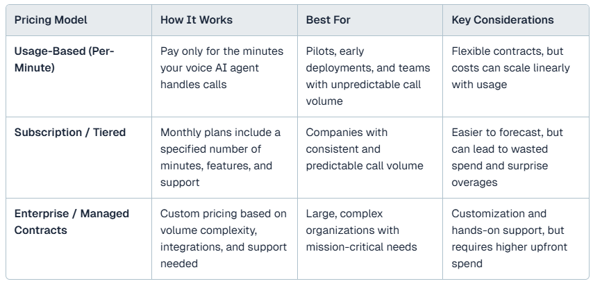 No single pricing model is universally the best. The right choice depends on predictability of call volume, complexity of use case, and how much internal ownership your team is willing to take on. Some vendors price on a per-minute basis, while others offer subscription-based pricing. For enterprise customers, it’s more common to see custom pricing based on complexity and unique use cases within the organization. Some of the most common pricing models include: